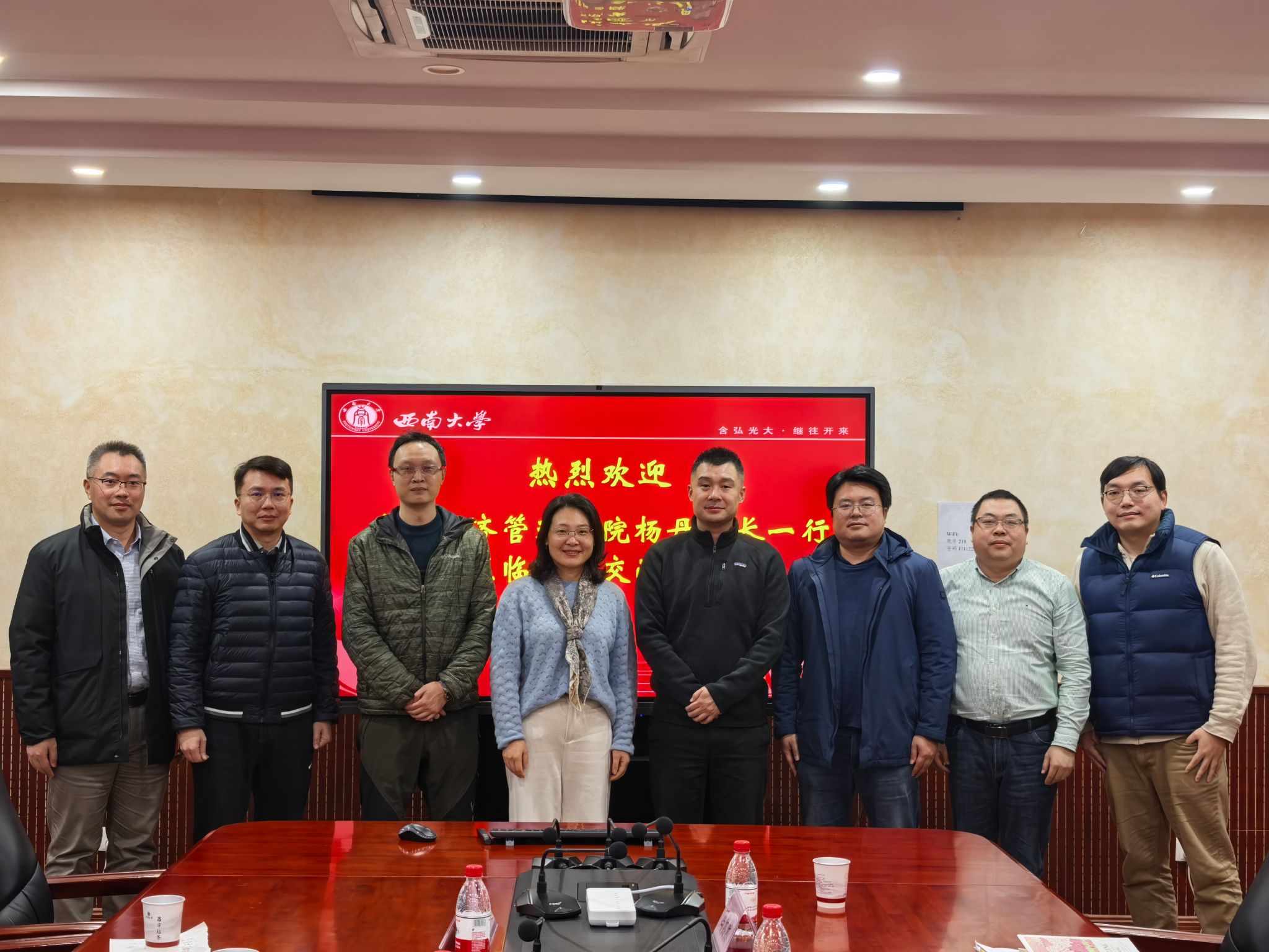 2025年12月11日,学校经济管理学院院长杨丹教授率教师代表一行到访学院,围绕文科实验室建设、跨学科科研合作等主题进行专题调研与座谈。学院院长罗雷教授、副院长张保顺教授、副院长张霄教授及外事秘书冯然然等参会交流。