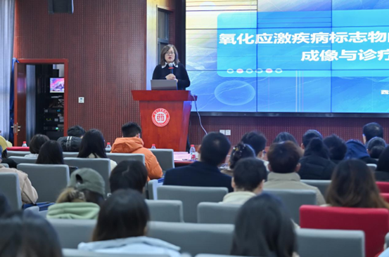 随后,李平教授作了题为“氧化应激疾病标志物的脑部原位荧光成像与诊疗研究”的学术报告。她从脑部疾病发病率高、临床诊疗面临挑战的现实背景出发,系统介绍了其团队在脑部原位成像与诊疗一体化方面的系列成果。针对抑郁症等疾病存在机制不清、诊断滞后、疗效不佳的问题,团队提出“恢复氧化还原稳态与去甲肾上腺素平衡”的新型治疗策略,通过定向改造牛磺酸衍生物突破血脑屏障,实现线粒体稳态调控与抗抑郁效应。此外,李教授还分享了在构建脑区选择性荧光探针、实现氧化应激标志物动态可视化方面的创新方法。