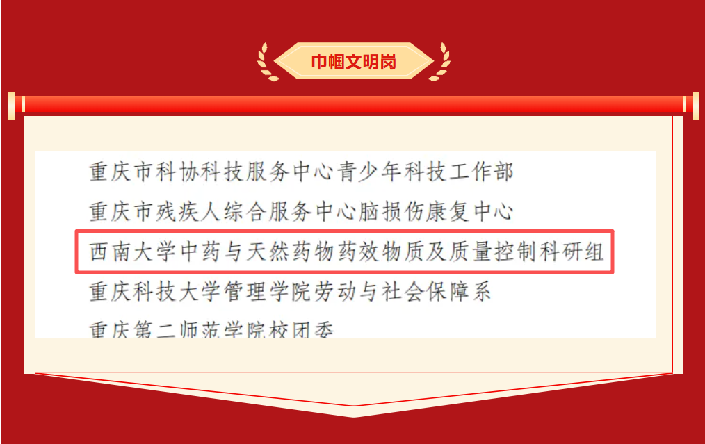 日前,重庆市人力资源和社会保障局、重庆市妇女联合会公布三八红旗手标兵、三八红旗手(集体)和巾帼文明岗表彰名单,学院陈敏教授领衔的中药与天然药物药效物质及质量控制科研组被授予“巾帼文明岗”称号。