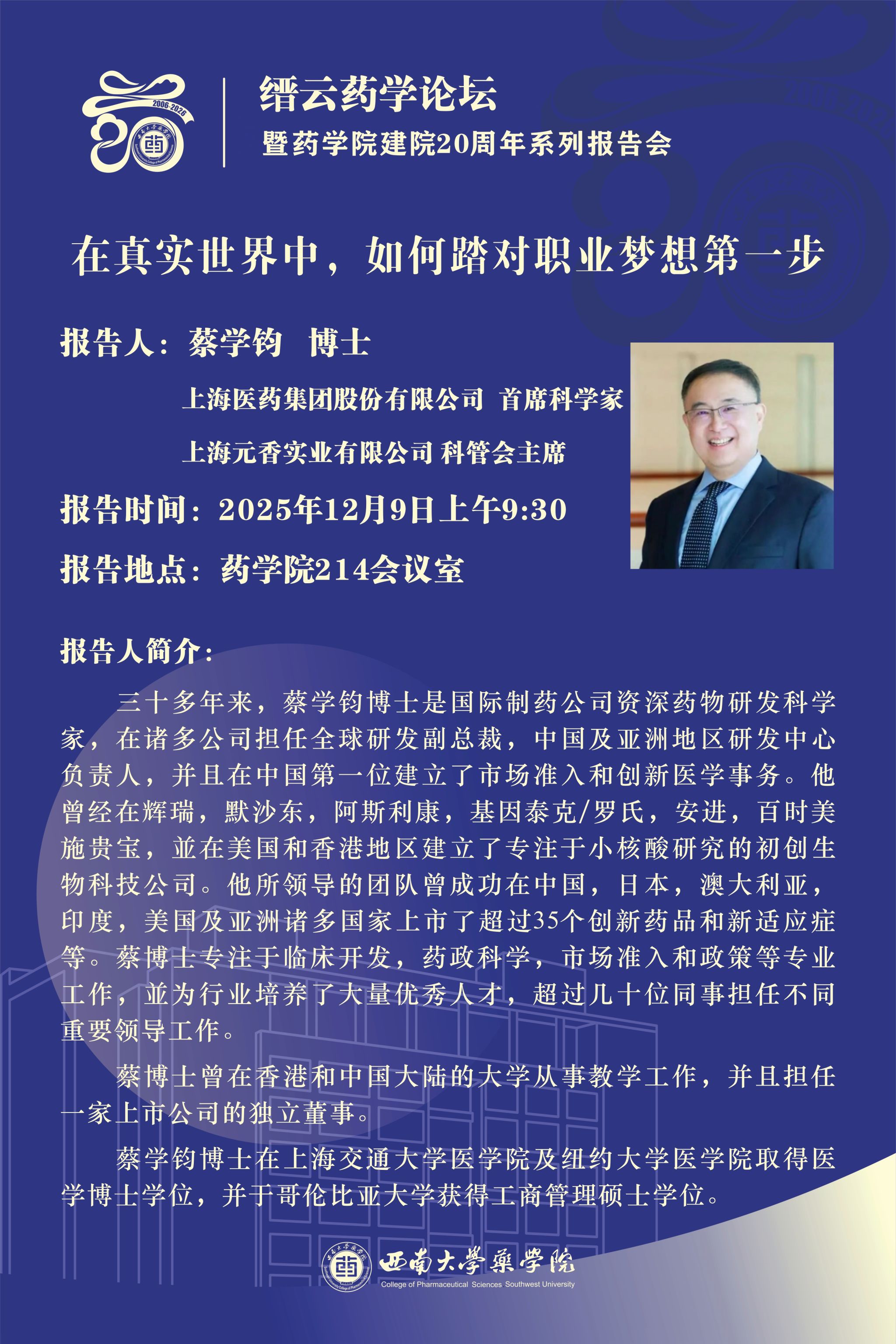缙云药学论坛暨药学院建院20周年系列报告会(二十三):蔡学钧学术报告