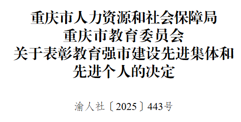 重庆市人力资源和社会保障局、重庆市教育委员会联合发布《关于表彰教育强市建设先进集体和先进个人的决定》https://rlsbj.cq.gov.cn/zwxx_182/tzgg/202509/t20250922_15029086.html